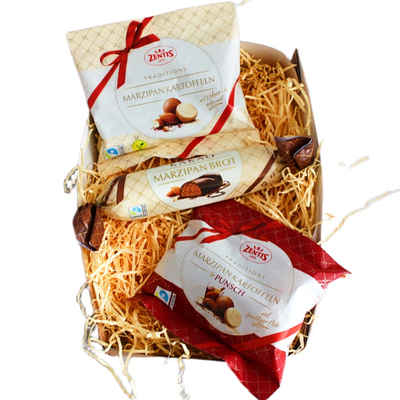 В составе марципановая буханка с какао весом 100 грамм и две упаковки марципановой картошки - классическая и со вкусом пунша. Производитель: Zentis